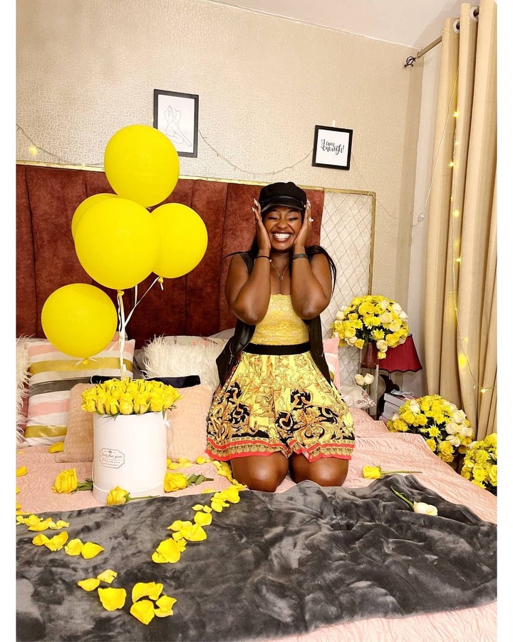 In the corridor that leads to her bedroom, there were papers with words of praise written on them. In the bedroom, beautiful yellow fairy lights hang on the wall, balloon and a bouquet of yellow roses were on her bed.