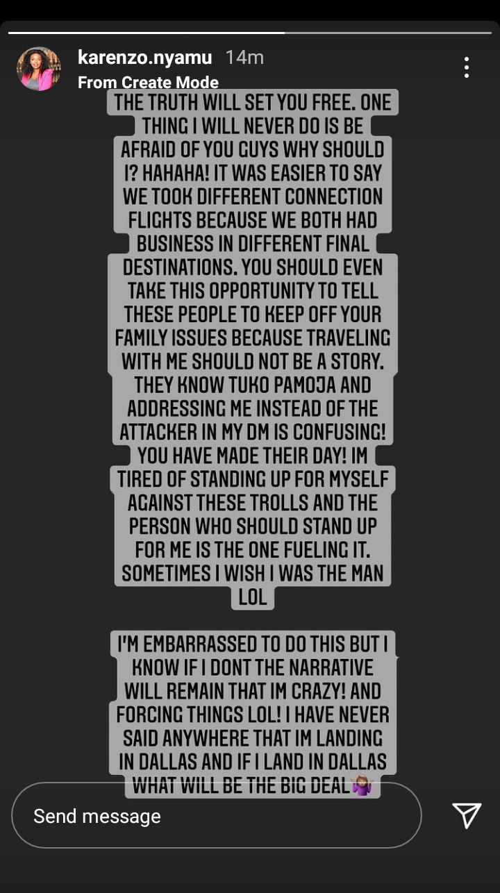 Saa chache baada ya kufanya hivi, Mwanasiasa Karen Nyamu, mamake mtoto mchanga, alishiriki picha yake akiwa ndani ya ndege. Picha yake ilizua uvumi, na watumiaji wa mtandao walihoji ikiwa alikuwa akisafiri naye.